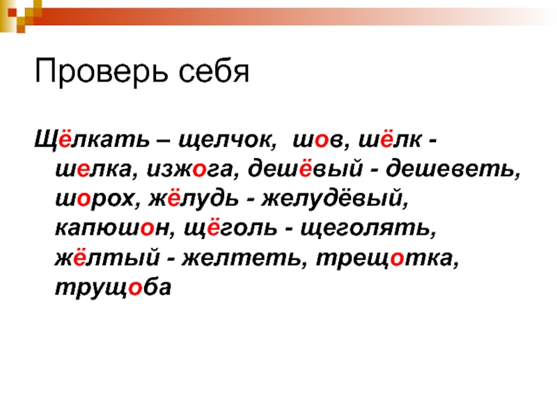 Щ...лкать, ш...в, ш...лк, ш...рох, деш...вый, ж...лудь,