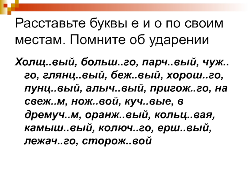 Слайд 10Расставьте буквы е и о по своим местам. Помните об ударении