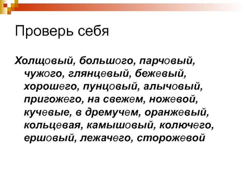 больш..го, парч..вый, чуж..го, глянц..вый, беж..вый, хорош..го, пунц..вый, алыч..вый, пригож..го, на свеж..м, нож..вой, куч..вые, в дремуч..м, оранж..вый, кольц..вая, камыш..вый, колюч..го, ерш..вый, лежач..го, сторож..вой