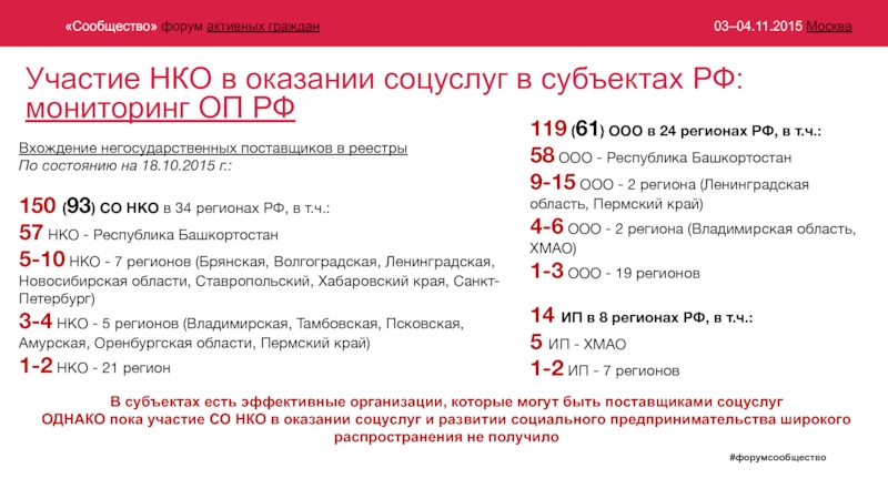 ОДНАКО пока участие СО НКО в оказании соцуслуг и развитии социального предпринимательства широкого распространения не получило