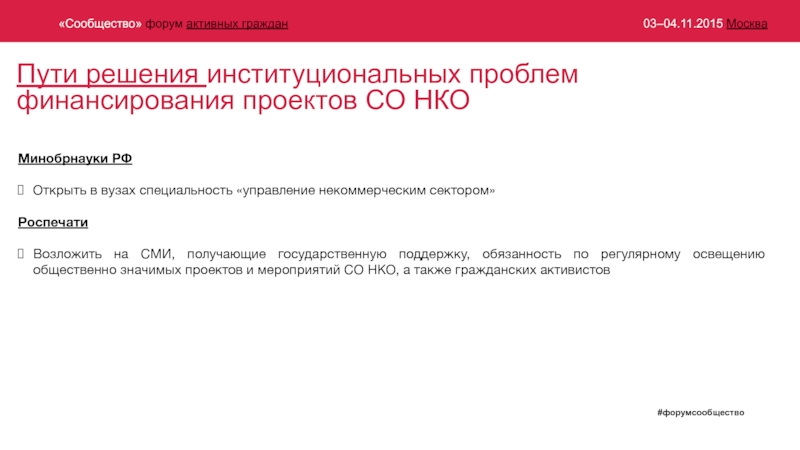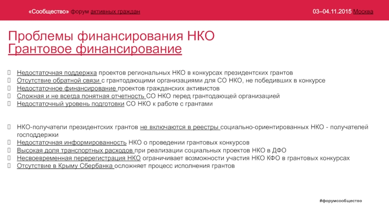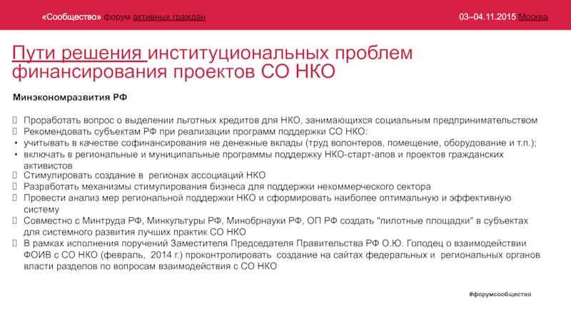 отсутствие у СО НКО равных с организациями МСП возможностей по использованию финансовых инструментов поддержки их деятельности.