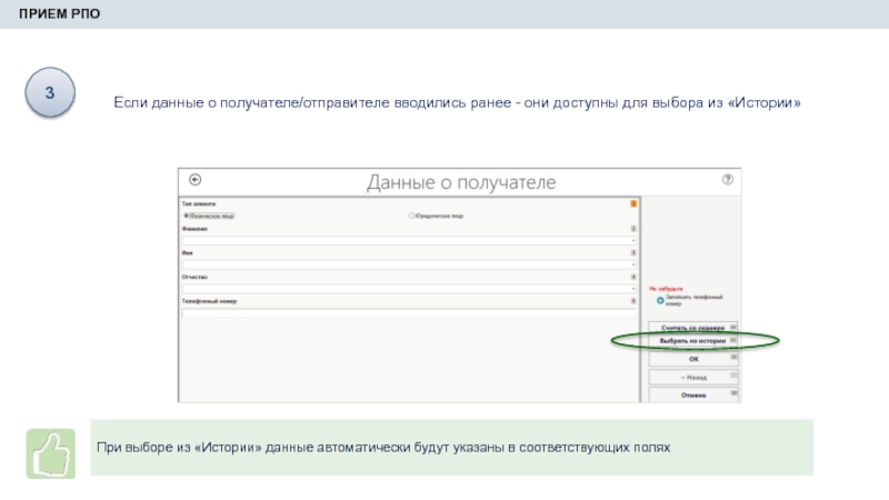 При выборе из «Истории» данные автоматически будут указаны в соответствующих полях
