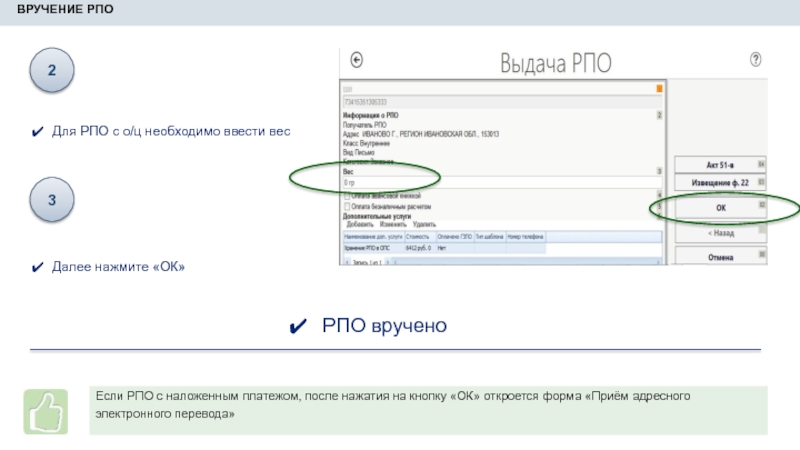 Если РПО с наложенным платежом, после нажатия на кнопку «ОК» откроется форма «Приём адресного электронного перевода»