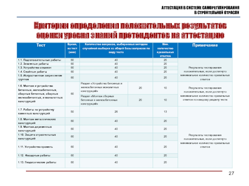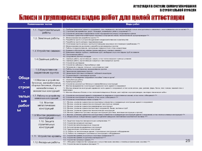 определяет группировку видов работ для целей аттестации, порядок формирования вопросов-ответов для тестирования