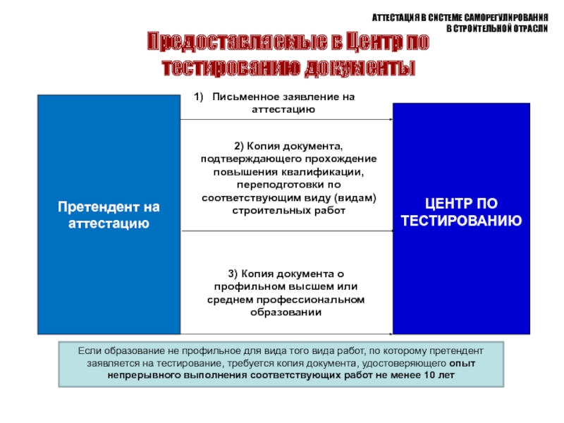 Если образование не профильное для вида того вида работ, по которому претендент заявляется на тестирование, требуется копия документа, удостоверяющего опыт непрерывного выполнения соответствующих работ не менее 10 лет