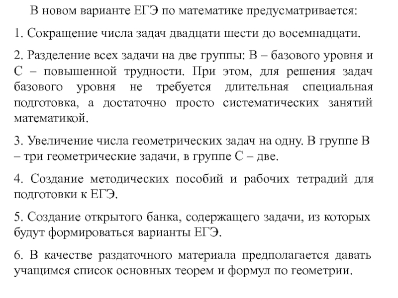 Слайд 4В новом варианте ЕГЭ по математике предусматривается:
