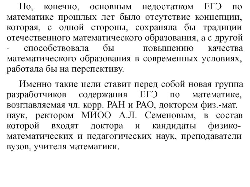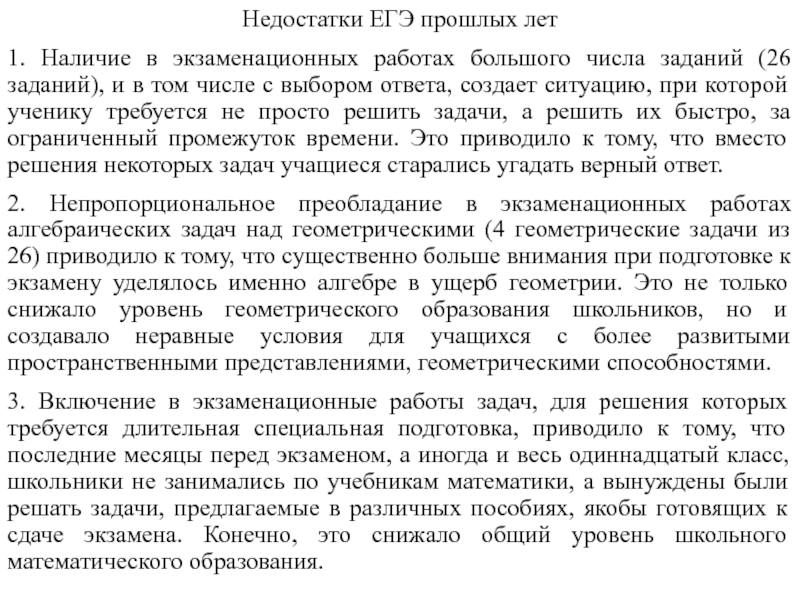 Слайд 3 Но, конечно, основным недостатком ЕГЭ по математике прошлых лет было отсутствие