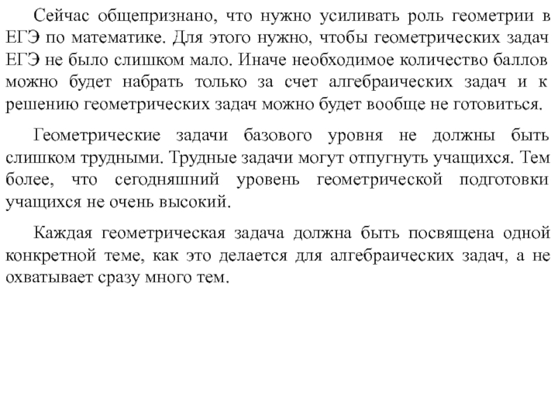 Слайд 5 Сейчас общепризнано, что нужно усиливать роль геометрии в ЕГЭ по математике.