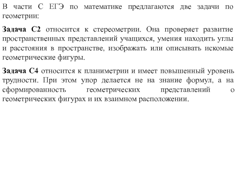 Слайд 7В части С ЕГЭ по математике предлагаются две задачи по геометрии: