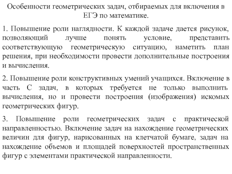 Слайд 8Особенности геометрических задач, отбираемых для включения в ЕГЭ по математике.