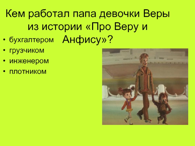 Слайд 25Кем работал папа девочки Веры из истории «Про Веру и Анфису»?