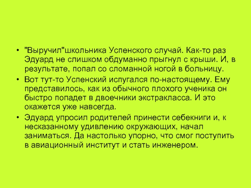 Слайд 6"Выручил"школьника Успенского случай. Как-то раз Эдуард не слишком обдуманно прыгнул с
