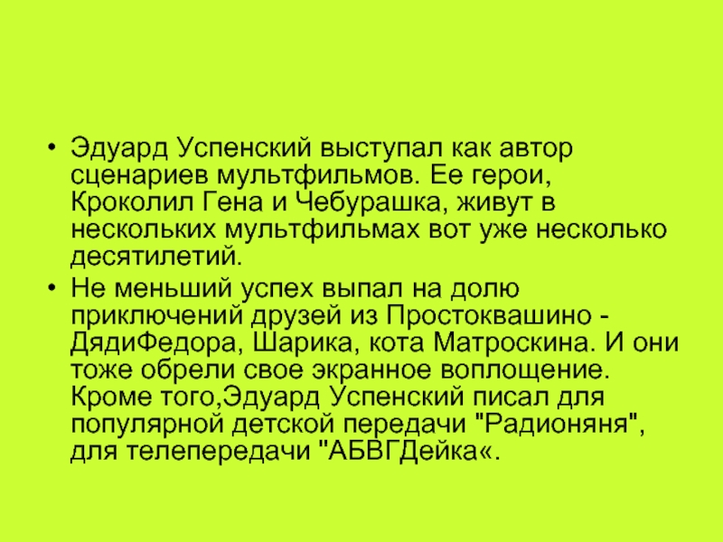 Слайд 3Эдуард Успенский выступал как автор сценариев мультфильмов. Ее герои, Кроколил Гена