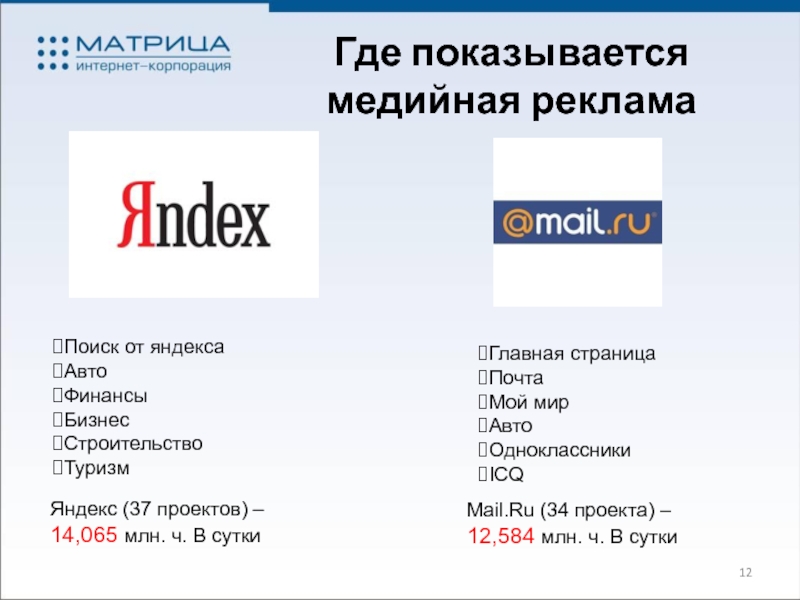 Mail.Ru (34 проекта) – 12,584 млн. ч. В сутки