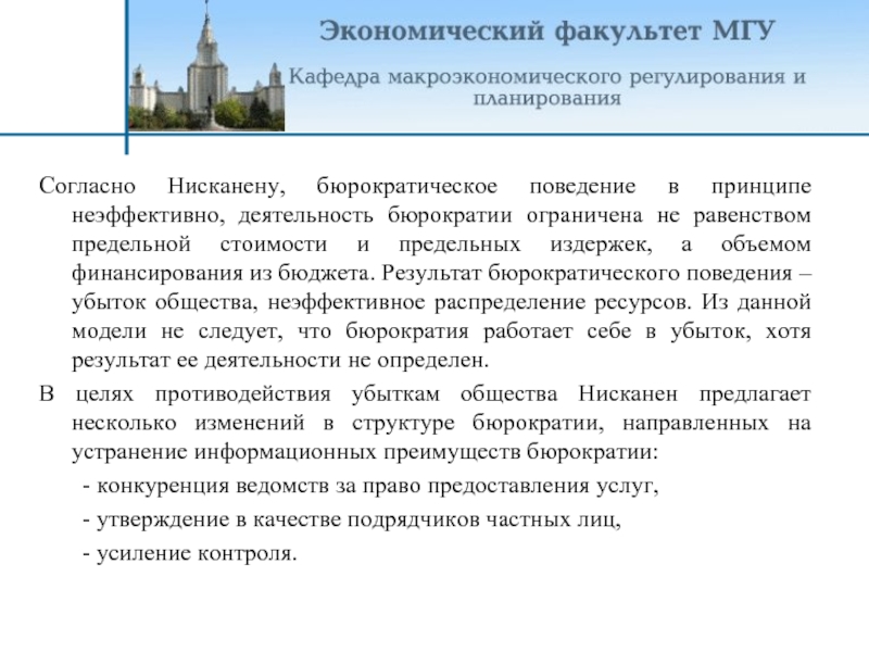 Согласно Нисканену, бюрократическое поведение в принципе неэффективно, деятельность бюрократии ограничена не