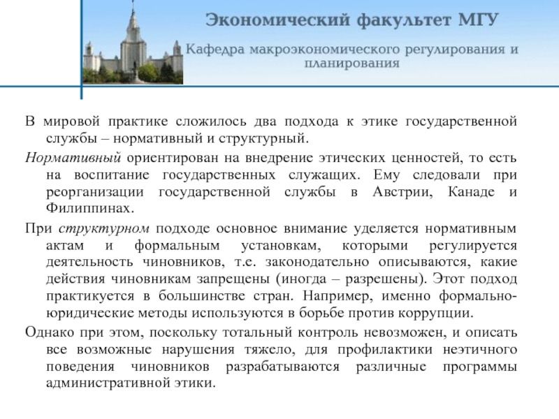 В мировой практике сложилось два подхода к этике государственной службы –