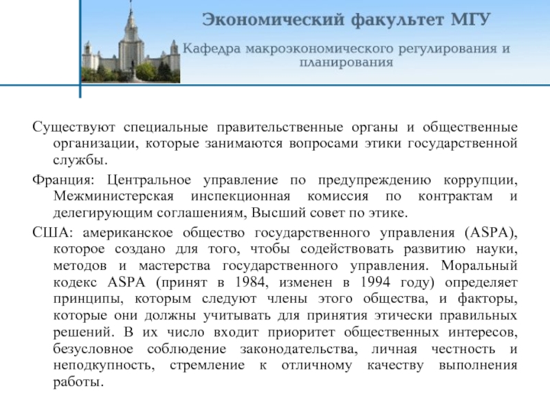США: американское общество государственного управления (ASPA), которое создано для того, чтобы содействовать развитию науки, методов и мастерства государственного управления. Моральный кодекс ASPA (принят в 1984, изменен в 1994 году) определяет принципы, которым следуют члены этого общества, и факторы, которые они должны учитывать для принятия этически правильных решений. В их число входит приоритет общественных интересов, безусловное соблюдение законодательства, личная честность и неподкупность, стремление к отличному качеству выполнения работы.