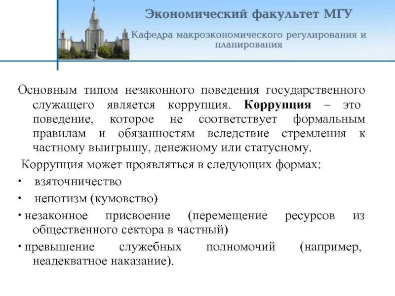 Слайд 11Основным типом незаконного поведения государственного служащего является коррупция. Коррупция – это