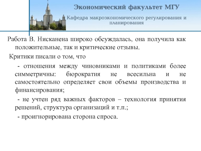 Слайд 4Работа В. Нисканена широко обсуждалась, она получила как положительные, так и