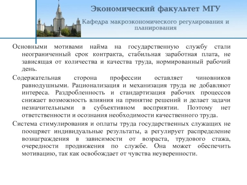 Основными мотивами найма на государственную службу стали неограниченный срок контракта, стабильная