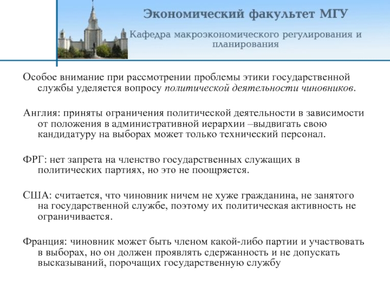 Слайд 10Особое внимание при рассмотрении проблемы этики государственной службы уделяется вопросу политической