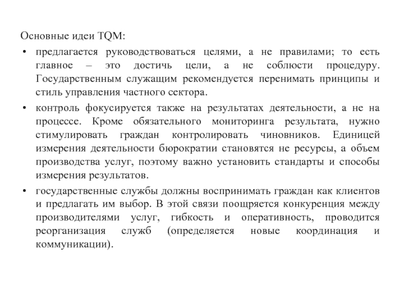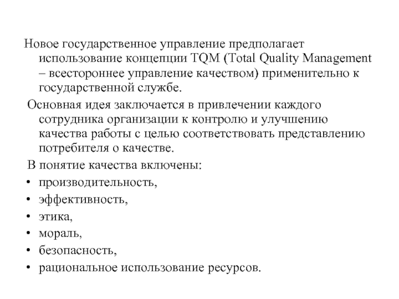 Слайд 16Новое государственное управление предполагает использование концепции TQM (Total Quality Management –