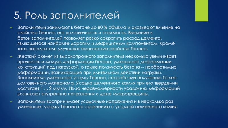 Жесткий скелет из высокопрочного заполнителя несколько увеличивает прочность и модуль деформации бетона, уменьшает деформации конструкций под нагрузкой, о также ползучесть бетона -- необратимые деформации, возникающие при длительном действии нагрузки. Заполнитель уменьшает усадку бетона, способствуя получению более долговечного материала. Усадка цементного камня при его твердении достигает 1 ... 2 мм/м. Из-за неравномерности усадочных деформаций возникают внутренние напряжения и даже микротрещины.