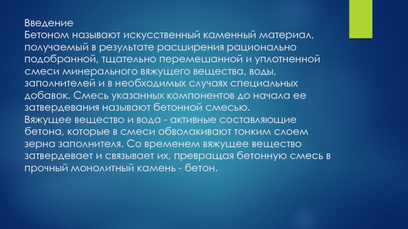Бетоном называют искусственный каменный материал, получаемый в результате расширения рационально подобранной,