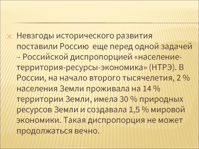 диспропорцией «население-территория-ресурсы-экономика» (НТРЭ). В России, на начало второго тысячелетия, 2 % населения Земли проживала на 14 % территории Земли, имела 30 % природных ресурсов Земли и создавала 1,5 % мировой экономики. Такая диспропорция не может продолжаться вечно.