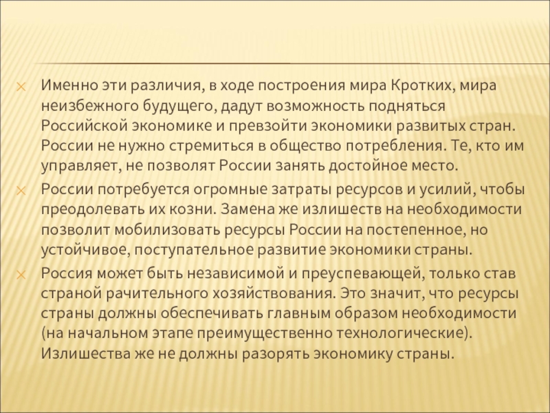 Слайд 29Россия должна строить противоположный миру потребления мир кротких, мир рачительного, высокоэффективного,