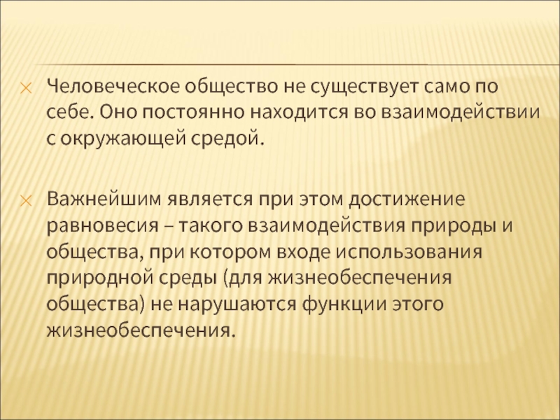 Важнейшим является при этом достижение равновесия – такого взаимодействия природы и общества, при котором входе использования природной среды (для жизнеобеспечения общества) не нарушаются функции этого жизнеобеспечения.