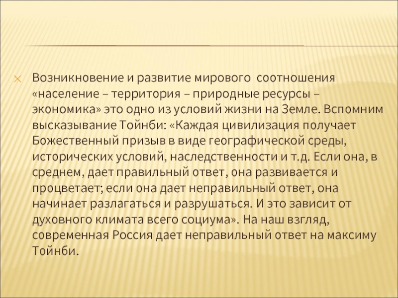 – экономика» это одно из условий жизни на Земле. Вспомним высказывание Тойнби: «Каждая цивилизация получает Божественный призыв в виде географической среды, исторических условий, наследственности и т.д. Если она, в среднем, дает правильный ответ, она развивается и процветает; если она дает неправильный ответ, она начинает разлагаться и разрушаться. И это зависит от духовного климата всего социума». На наш взгляд, современная Россия дает неправильный ответ на максиму Тойнби.