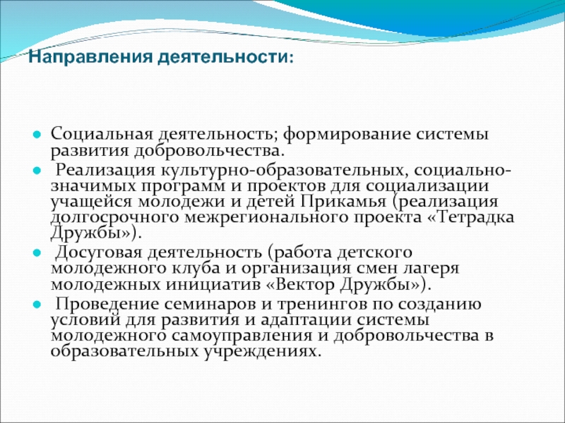 в организации реализуется в рамках социально-значимых молодежных инициатив создания условий для раскрытия учебно-творческого потенциала и мотивации учебной, творческой и социально направленной деятельности школьников и учащейся молодежи; улучшения, развития и решения задач по социальной защите населения.