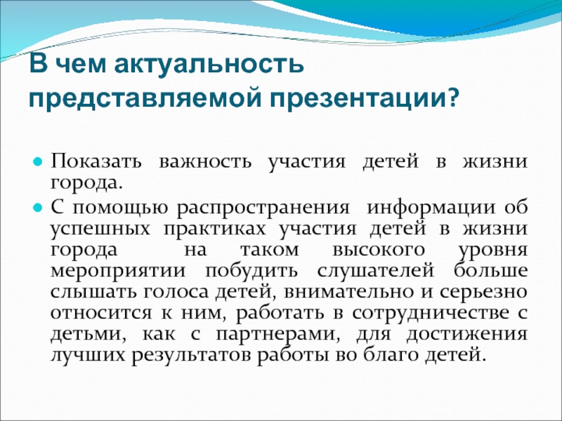 помощью распространения информации об успешных практиках участия детей в жизни города на таком высокого уровня мероприятии побудить слушателей больше слышать голоса детей, внимательно и серьезно относится к ним, работать в сотрудничестве с детьми, как с партнерами, для достижения лучших результатов работы во благо детей.
