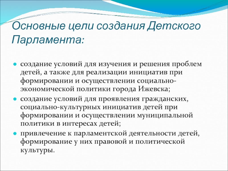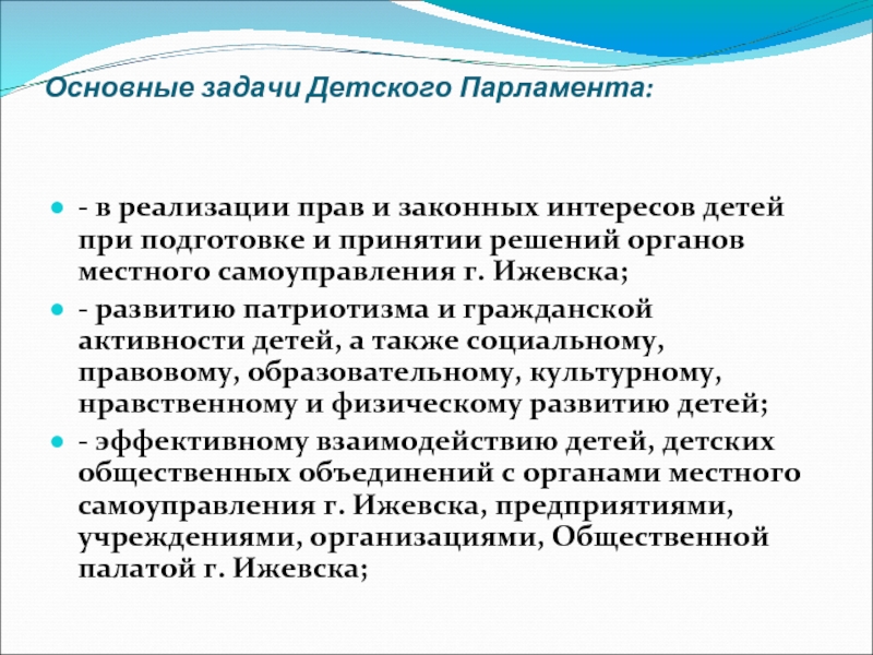 Детский Парламент представляет интересы детей, проживающих в муниципальном образовании «город Ижевск», во взаимоотношениях с органами местного самоуправления муниципального образования «город Ижевск», предприятиями, учреждениями, организациями в рамках реализации в городе Ижевске международного движения «Города, доброжелательные к детям».