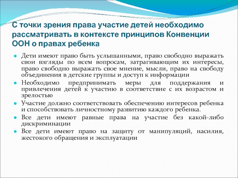 Слайд 3С точки зрения права участие детей необходимо рассматривать в контексте принципов
