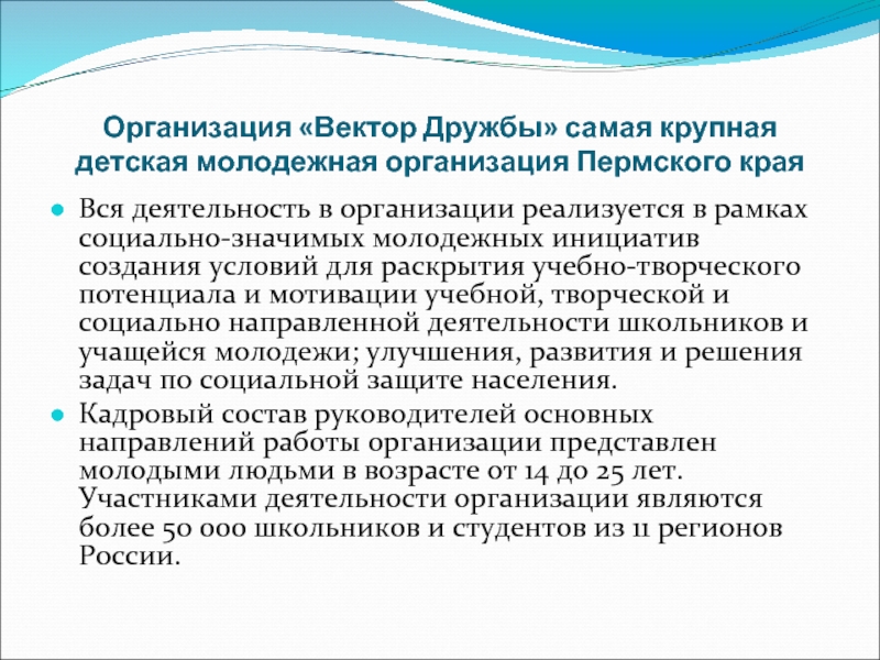 Слайд 14Организация «Вектор Дружбы» самая крупная детская молодежная организация Пермского края