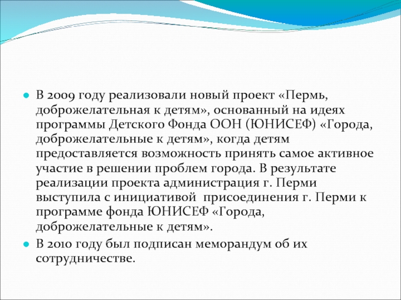 на идеях программы Детского Фонда ООН (ЮНИСЕФ) «Города, доброжелательные к детям», когда детям предоставляется возможность принять самое активное участие в решении проблем города. В результате реализации проекта администрация г. Перми выступила с инициативой присоединения г. Перми к программе фонда ЮНИСЕФ «Города, доброжелательные к детям».