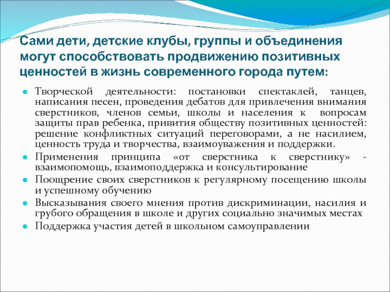 Слайд 4Сами дети, детские клубы, группы и объединения могут способствовать продвижению позитивных
