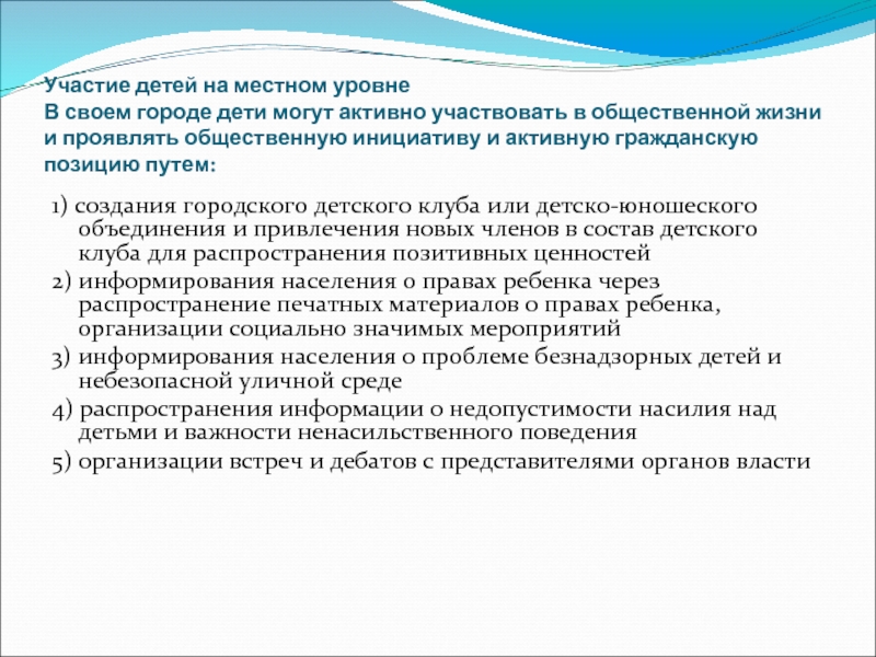 Слайд 5Участие детей в жизни города на различных уровнях: