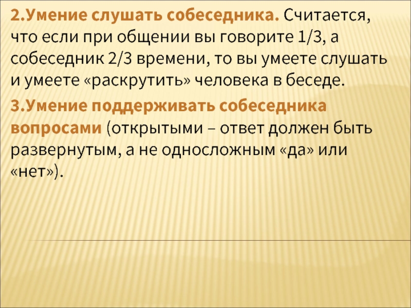 а собеседник 2/3 времени, то вы умеете слушать и умеете «раскрутить» человека в беседе.