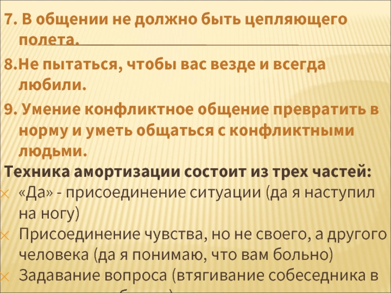 9. Умение конфликтное общение превратить в норму и уметь общаться с конфликтными людьми.