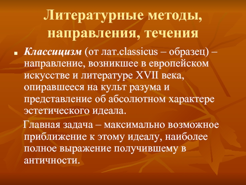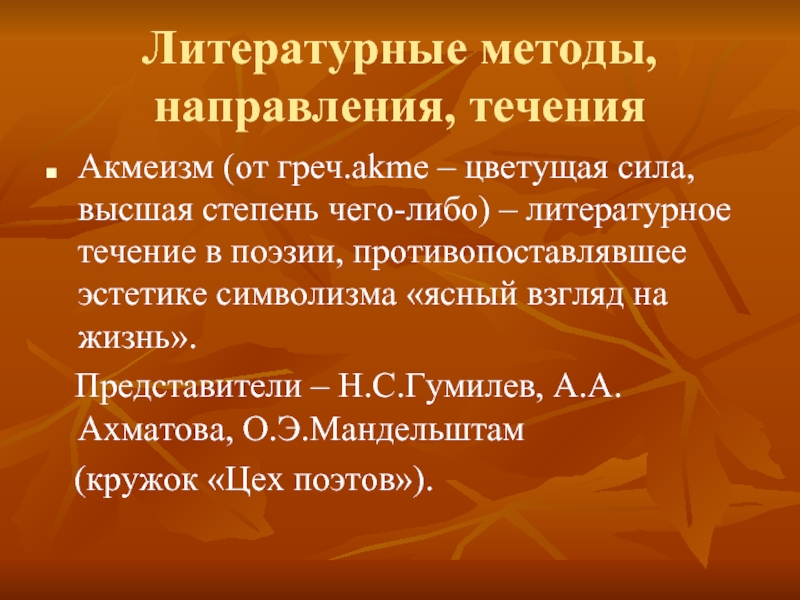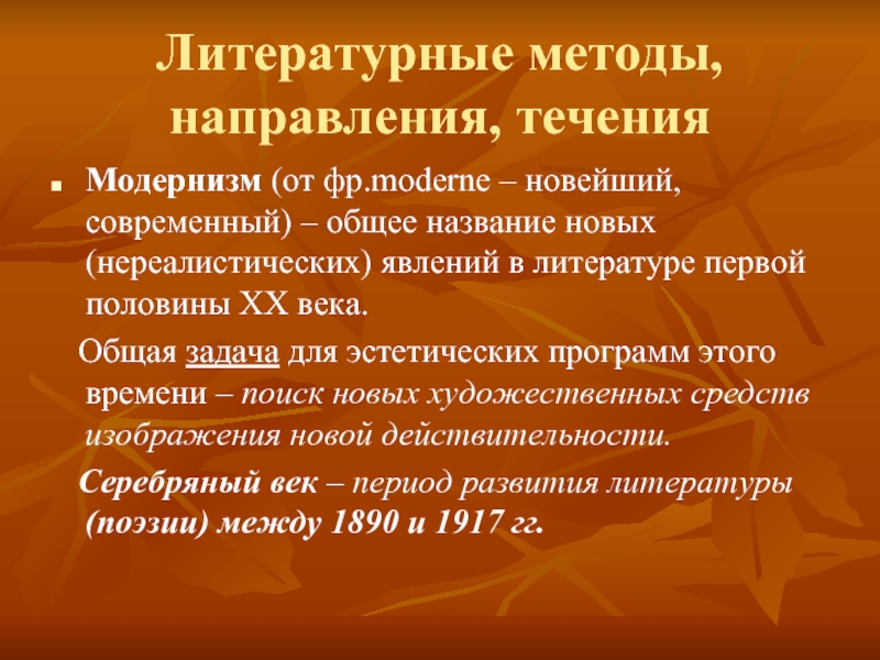 Литературные методы, направления и течения: классицизм, сентиментализм, романтизм, реализм, модернизм (символизм, акмеизм, футуризм)