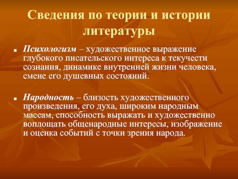 Народность – близость художественного произведения, его духа, широким народным массам, способность выражать и художественно воплощать общенародные интересы, изображение и оценка событий с точки зрения народа.