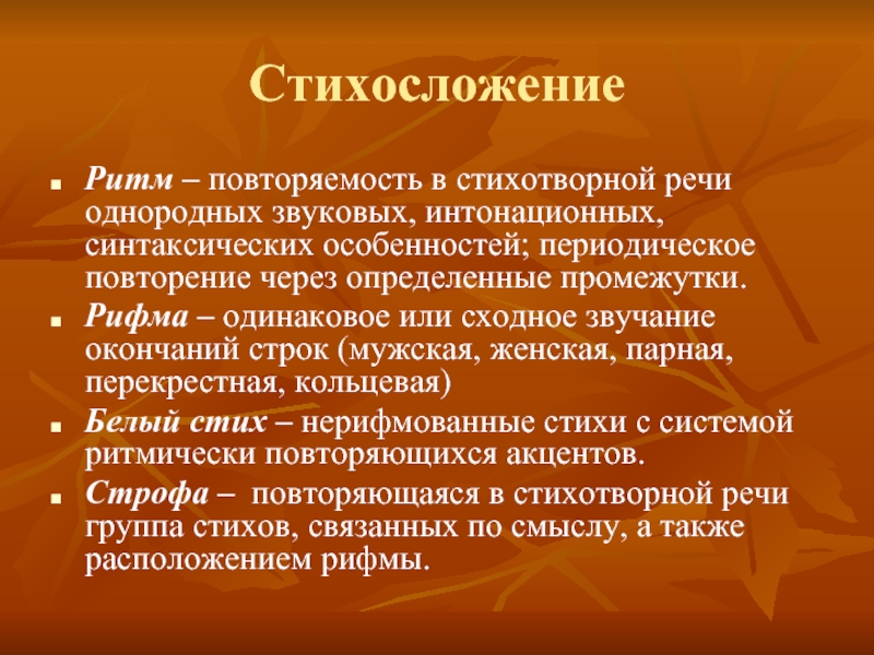 Ритм – повторяемость в стихотворной речи однородных звуковых, интонационных, синтаксических особенностей;