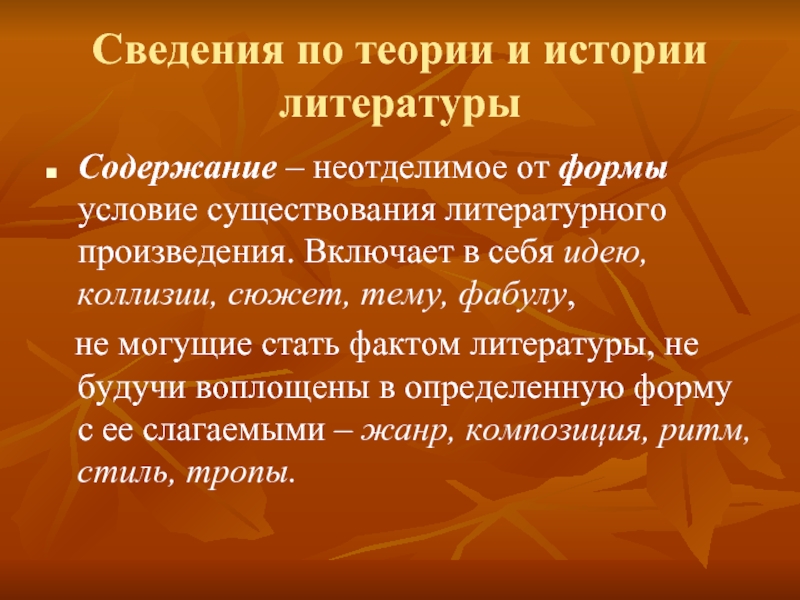существования литературного произведения. Включает в себя идею, коллизии, сюжет, тему, фабулу,