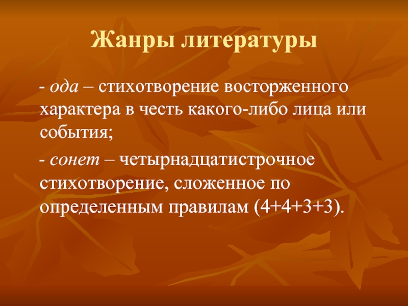 2)деление на жанры: «высокий»(трагедия, ода) и «низкий» (комедия, басня);