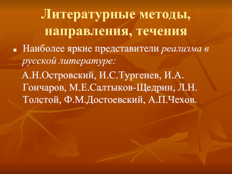 А.Н.Островский, И.С.Тургенев, И.А.Гончаров, М.Е.Салтыков-Щедрин, Л.Н.Толстой, Ф.М.Достоевский, А.П.Чехов.