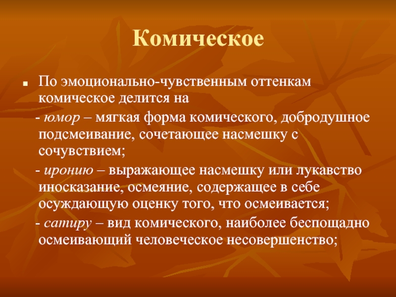 - сатиру – вид комического, наиболее беспощадно осмеивающий человеческое несовершенство;