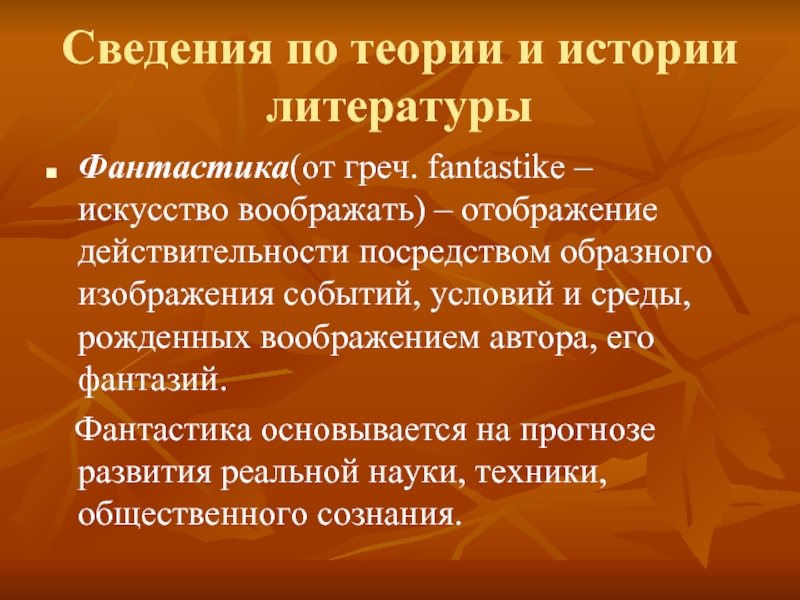 – отображение действительности посредством образного изображения событий, условий и среды, рожденных воображением автора, его фантазий.